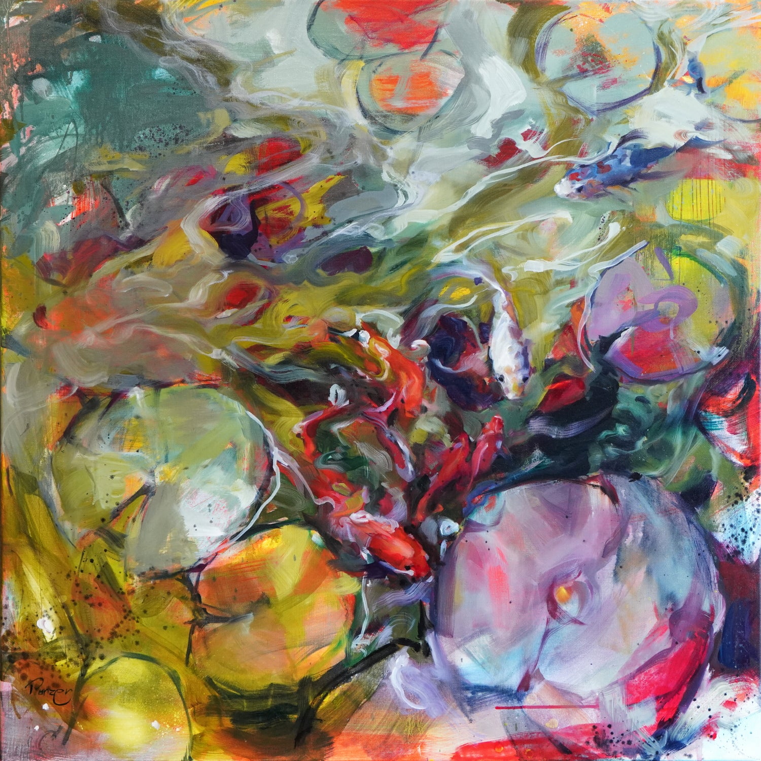 Der idyllische Gartenteich der Künstlerin diente als Inspiration für dieses Gemälde. Die Frische und Klarheit des Wassers sind meisterhaft dargestellt und fangen die lebendige Freude der Fische eindrucksvoll ein.
