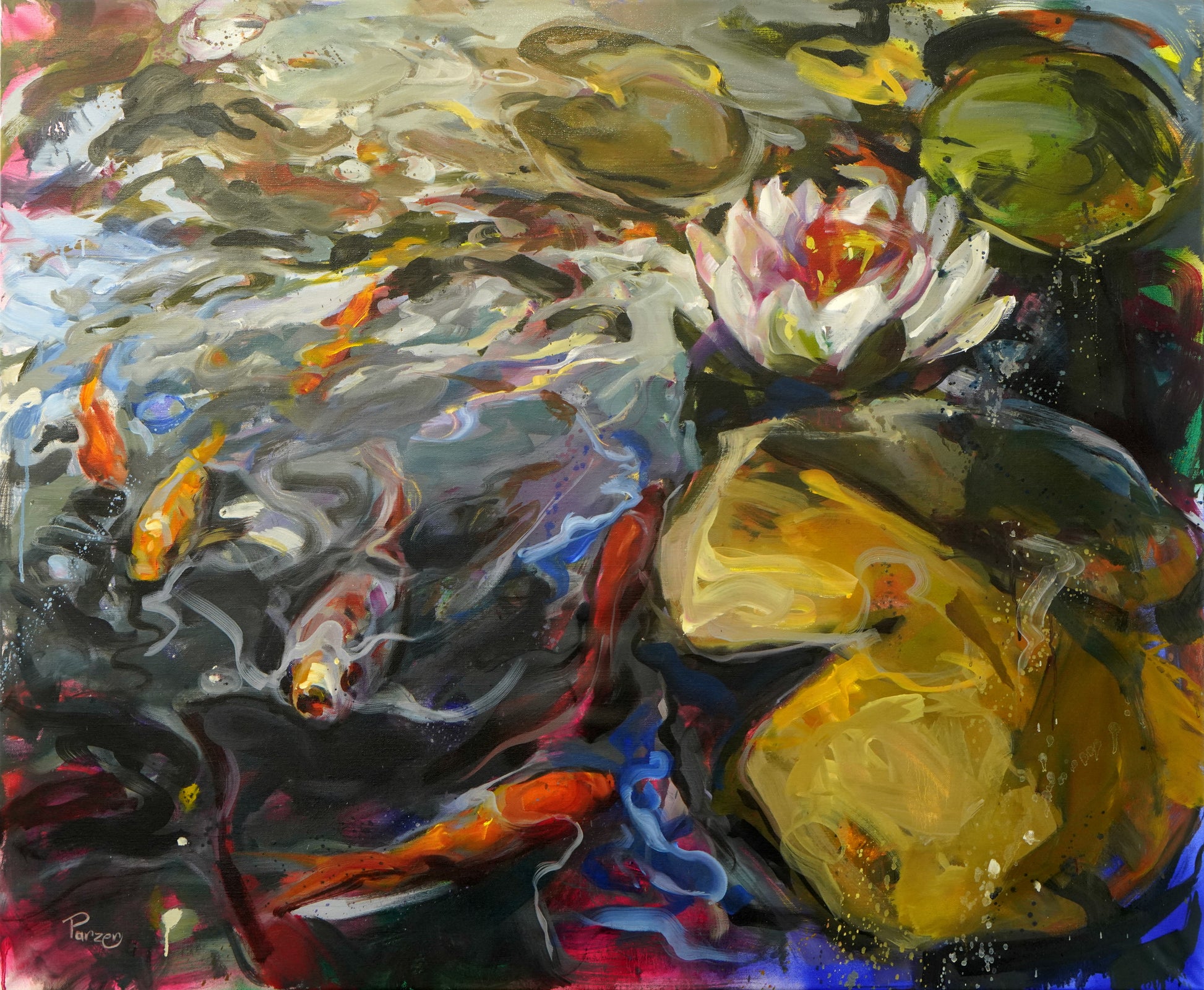 Der idyllische Gartenteich der Künstlerin diente als Inspiration für dieses Gemälde. Die Frische und Klarheit des Wassers sind meisterhaft dargestellt und fangen die lebendige Freude der Fische eindrucksvoll ein.