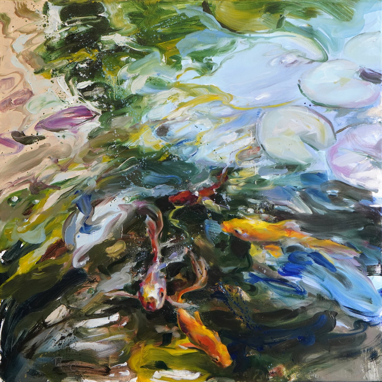 Der idyllische Gartenteich der Künstlerin diente als Inspiration für dieses Gemälde. Die Frische und Klarheit des Wassers sind meisterhaft dargestellt und fangen die lebendige Freude der Fische eindrucksvoll ein.